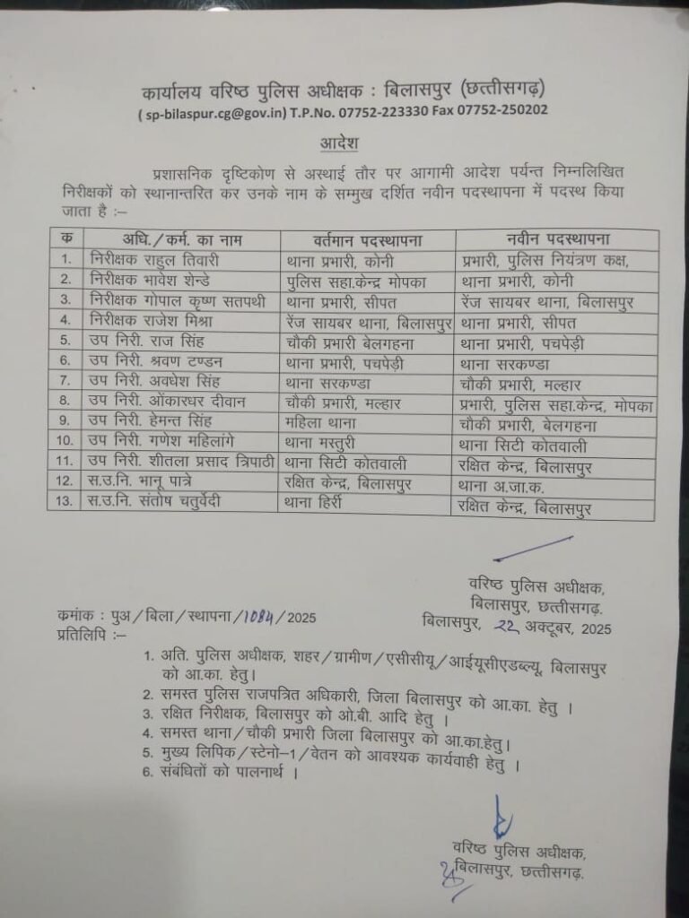 बिलासपुर। दीपावली के बाद, बिलासपुर में कई थाने और चौकियों के प्रभारी बदल दिए गए हैं।