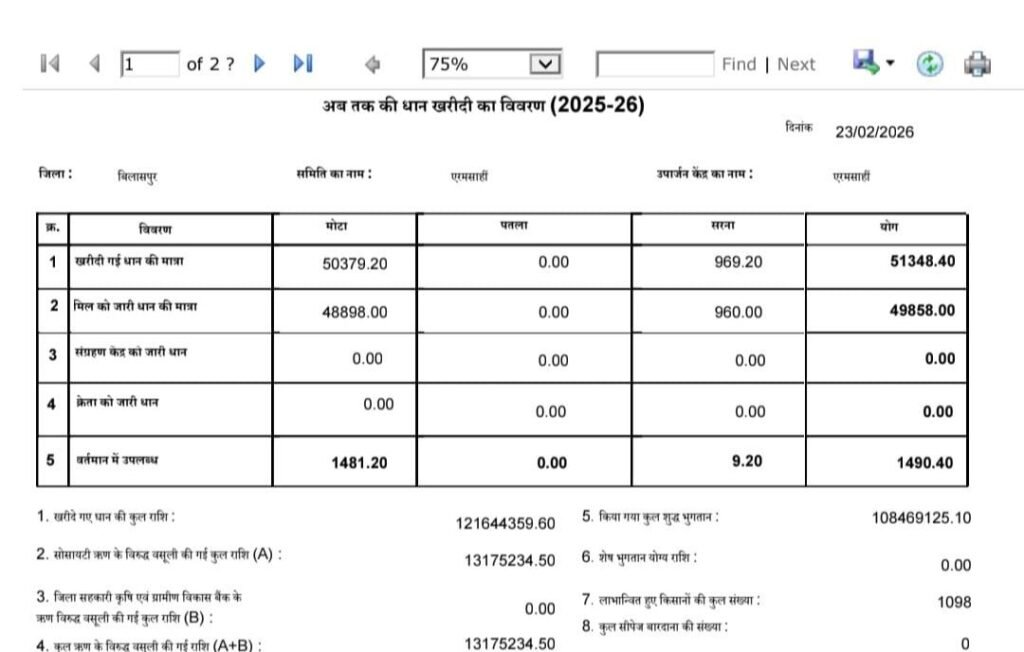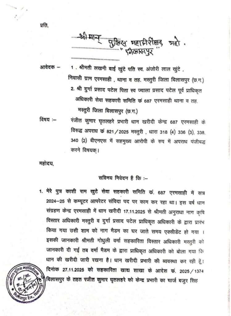 बिलासपुर- बिलासपुर जिले के सेवा सहकारी समिति क्रमांक 687 एरमसाही धान खरीदी केंद्र में बड़ी वित्तीय अनियमितता का मामला सामने आया है। प्रारंभिक जानकारी के अनुसार धान खरीदी रिकॉर्ड और भौतिक स्टॉक के मिलान में 1490.40 क्विंटल धान की कमी पाई गई है, जिससे शासन को लगभग 35 लाख 30 हजार 750 रुपये का नुकसान होने का अनुमान लगाया गया है।