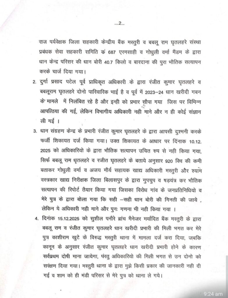 धान खरीदी केंद्र में 1490 क्विंटल धान की कमी, 35 लाख से अधिक की गड़बड़ी -खरीदी प्रभारी और संस्था प्रबंधक पर कार्रवाई की मांग, प्रशासन से जांच की अपील