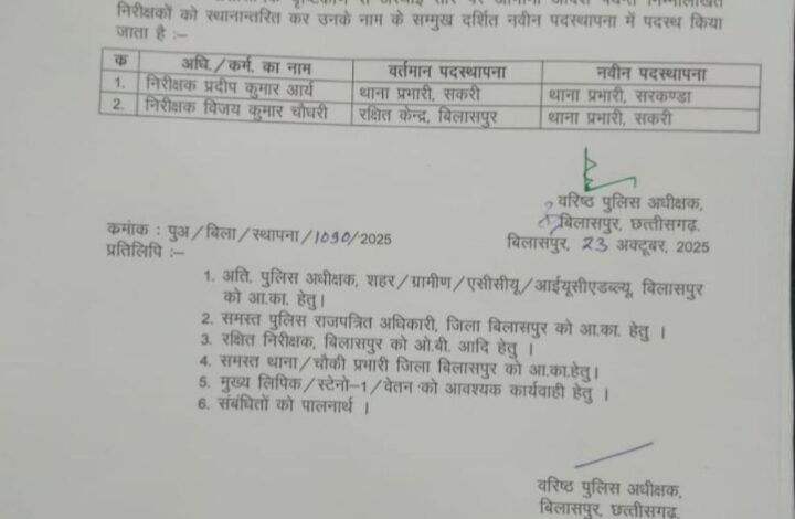 Bilaspur News:– जमीन विवाद के चलते सरकंडा टीआई लाइन अटैच, दो निरीक्षकों के भी तबादले