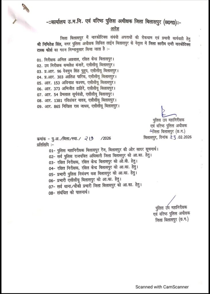 Bilaspur बिलासपुर। जिले में मादक पदार्थों के अवैध कारोबार पर प्रभावी अंकुश लगाने के लिए पुलिस प्रशासन ने विशेष एंटी नारकोटिक्स टास्क फोर्स का गठन किया है। यह नई टीम सीएसपी निमितेश सिंह की निगरानी में काम करेगी। टीम की कमान निरीक्षक अनिल अग्रवाल को सौंपी गई है। वहीं एसएसपी रजनेश सिंह ने हेड कांस्टेबल सहित कुल 9 आरक्षकों को इस विशेष दस्ते में शामिल किया है।