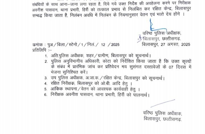 Bilaspur बिलासपुर। तीजा जैसे धार्मिक पर्व पर महिलाओं और उनके परिवारजनों को रोककर कठोर व्यवहार दिखाते हुए ट्रैफिक जांच करने वाले हिर्री थाना प्रभारी अवनीश पासवान को एसएसपी रजनेश सिंह ने निलंबित कर रक्षित केंद्र बिलासपुर में अटैच कर दिया है। 20 अगस्त की रात 10:30 बजे हुई क्राइम मीटिंग में एसएसपी ने सभी एडिशनल एसपी, राजपत्रित अधिकारी, थाना प्रभारी और ट्रैफिक पुलिस को यह स्पष्ट निर्देश दिया था कि वाहन चेकिंग विवेकपूर्ण तरीके से हो और केवल संदिग्धों पर कार्रवाई की जाए।