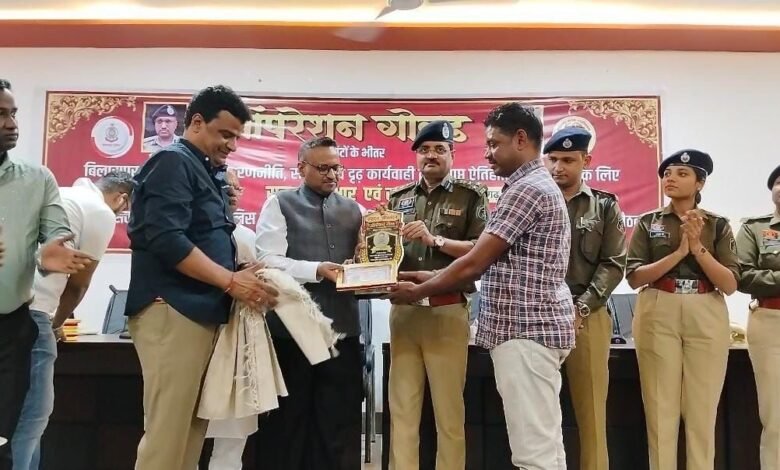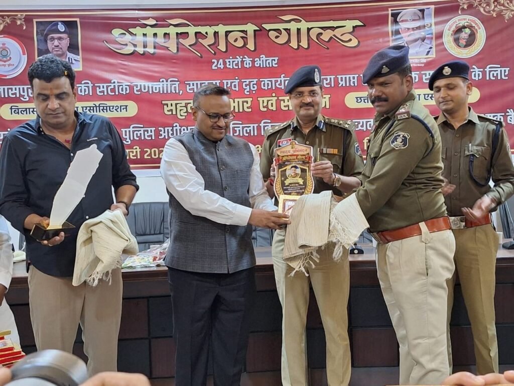 Bilaspur News: – सर्राफा व्यवसायी से लूट और हत्या का प्रयास करने वाले अंतर्राज्यीय गिरोह को 24 घंटे में गिरफ्तार कर शत प्रतिशत रिकवरी करने वाली टीम के सर्राफा एसोसिएशन ने किया सम्मान। बिलासा गुड़ी में पुलिस और सराफा व्यापारियों की अहम बैठक हुई। एसएसपी रजनेश सिंह की अध्यक्षता में आयोजित बैठक में सुरक्षा मानकों को कड़ाई से लागू करने पर जोर दिया गया। “ऑपरेशन गोल्ड” के तहत 24 घंटे में अंतरराज्यीय गिरोह को पकड़ने वाली टीम का सम्मान किया गया, जिसमें आईजी रामगोपाल गर्ग और एडिशनल एसपी पंकज पटेल सहित अधिकारी मौजूद रहे। प्रदेश सराफा संघ के अध्यक्ष कमल सोनी ने चेतावनी दी कि सुरक्षा निर्देशों का पालन नहीं करने वाले व्यापारियों की सदस्यता नवीनीकृत नहीं की जाएगी।