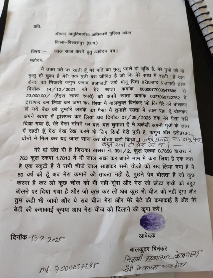 बिलासपुर। बेलगहना चौकी क्षेत्र की 80 वर्षीय विधवा महिला बालकुवर बिनंकर ने ग्राम केन्दा निवासी फगुन प्रसाद प्रजापति उर्फ मोनू एवं उसके पिता हरीप्रसाद प्रजापति पर धोखाधड़ी और धमकाने का गंभीर आरोप लगाया है।