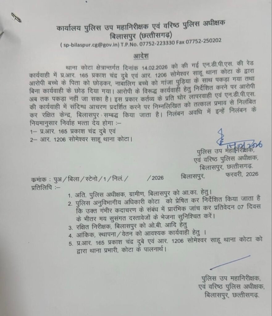 बिलासपुर। बिलासपुर जिले के कोटा थाना क्षेत्र में पुलिसकर्मियों की कार्यशैली पर गंभीर सवाल खड़े हो गए हैं। आरोप है कि गांजा बेचने के मामले में पकड़े गए एक नाबालिग आरोपी को थाने लाने के बाद कथित रूप से 80 हजार रुपये लेकर छोड़ दिया गया। मामले की जानकारी वरिष्ठ अधिकारियों तक पहुंचने के बाद तत्काल प्रभाव से प्रधान आरक्षक और आरक्षक को निलंबित कर दिया गया है।