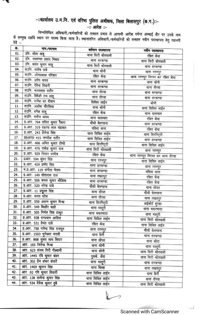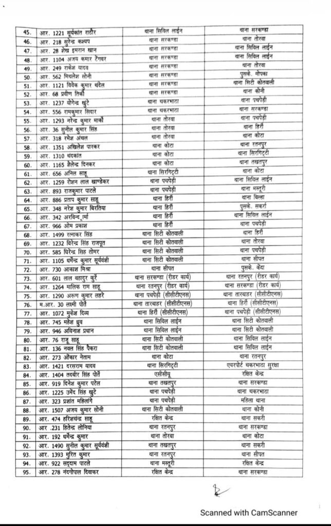 जारी किए गए आदेश के अनुसार कुल 130 पुलिसकर्मियों का स्थानांतरण किया गया है। इनमें 3 उप निरीक्षक (एसआई), 10 सहायक उप निरीक्षक (एएसआई), 23 प्रधान आरक्षक और 94 आरक्षक शामिल हैं। सभी को नई जिम्मेदारियों के साथ अन्य स्थानों पर पदस्थ किया गया है।