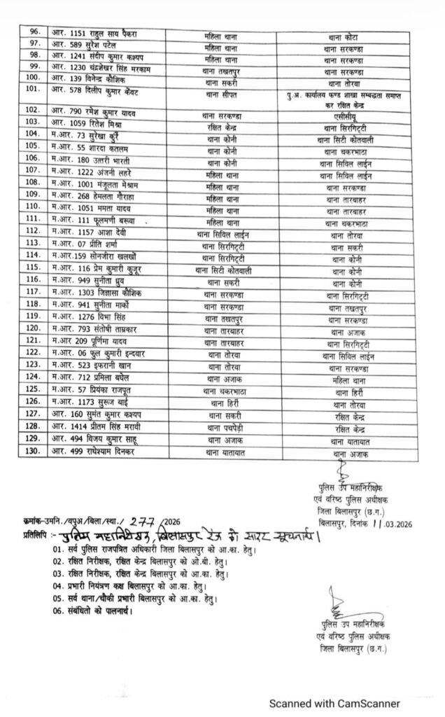 Bilaspur Police Transfer News:बिलासपुर पुलिस विभाग में बड़ी सर्जरी,एसएसपी रजनेश सिंह ने जारी किया तबादला आदेश एसआई–एएसआई समेत 130 पुलिसकर्मियों को मिली नई पोस्टिंग