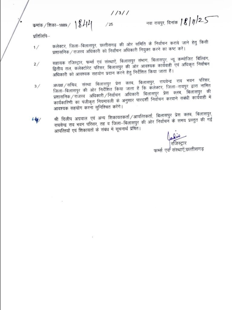 बिलासपुर प्रेस क्लब का चुनाव रद्दनिर्वाचन अधिकारी की लापरवाही पर रजिस्ट्रार की सख्ती अब नए अधिकारी की निगरानी में फिर से होगी पूरी प्रक्रिया