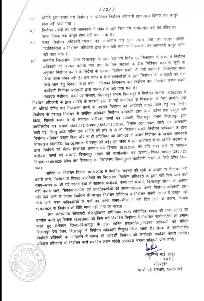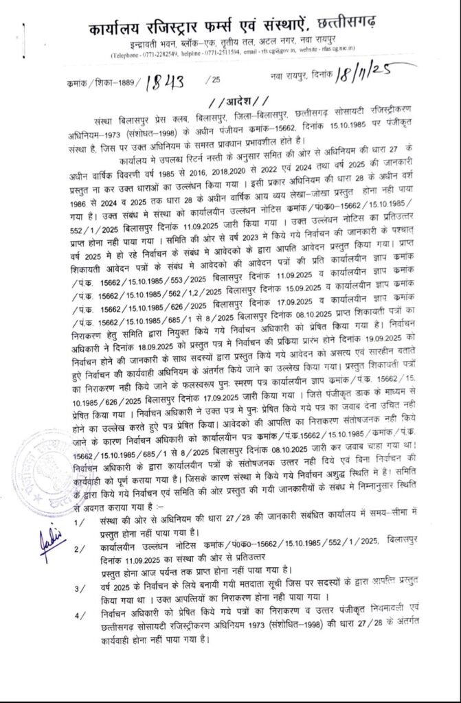 बिलासपुर।छत्तीसगढ़ शासन के फर्म्स एंड सोसाइटीज़ रजिस्ट्रार ने बिलासपुर प्रेस क्लब के वर्ष 2024-25 के लिए प्रस्तावित चुनाव को अमान्य घोषित कर दिया है। 18 नवंबर 2025 को जारी आदेश में कहा गया कि निर्वाचन प्रक्रिया के दौरान तय नियमों का पालन नहीं हुआ और निर्वाचन अधिकारी ने समय–सीमा में आवश्यक दस्तावेज तथा रिपोर्ट प्रस्तुत नहीं की।