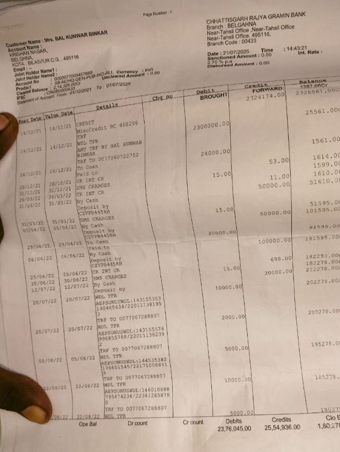 बिलासपुर/बेलगहना ग्राम की एक अशिक्षित विधवा महिला के साथ करोड़ों की ठगी जैसा गंभीर मामला सामने आया है। बेलगहना निवासी बाल कुंवर बिनकर ने पति और पुत्र की मृत्यु के बाद उनकी जमा-पूंजी के रूप में बैंक खाते में रखे करीब 23 लाख रुपये संजोकर रखे थे। महिला का आरोप है कि केंदा निवासी फागुन प्रजापति उर्फ़ मोनू ने उसकी अशिक्षा का फायदा उठाते हुए अंगूठे के निशान लेकर ग्रामीण बैंक के दस्तावेजों पर हस्ताक्षर कराए और रकम अपने खाते में ट्रांसफर करवा ली।