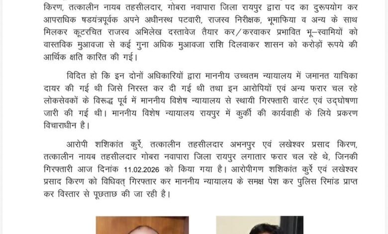 Raipur रायपुर। भारतमाला परियोजना में भूमि अधिग्रहण मुआवजा घोटाले के मामले में आर्थिक अपराध अन्वेषण ब्यूरो ने तत्कालीन तहसीलदार शशिकांत कुर्रे (वर्तमान डिप्टी कलेक्टर) और लखेश्वर प्रसाद किरण, तत्कालीन नायब तहसीलदार गोबरा नवापारा को गिरफ्तार किया है। आरोप है कि दोनों ने फर्जी मुआवजा दस्तावेज तैयार कर शासन को कुल 43 करोड़ रुपए का नुकसान पहुंचाया।