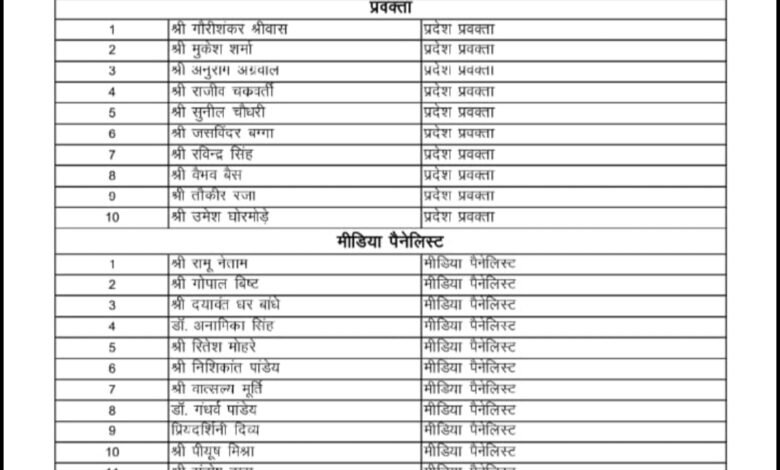 जारी सूची में प्रदेश मीडिया विभाग के विभिन्न पदों पर जिम्मेदारियां तय की गई हैं। इसमें प्रदेश संयोजक, प्रदेश प्रवक्ता, मीडिया सहसंयोजक के साथ-साथ मीडिया पैनलिस्टों के नाम भी शामिल हैं।