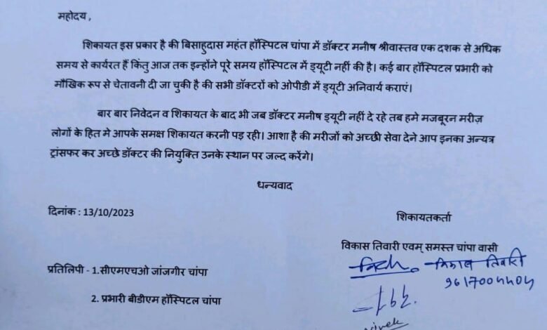 शिकायतकर्ताओं ने मांग की थी कि डॉ. मनीष श्रीवास्तव को चांपा से हटाया जाए, ताकि अस्पताल का संचालन नियमों और प्रक्रियाओं के अनुरूप हो सके।