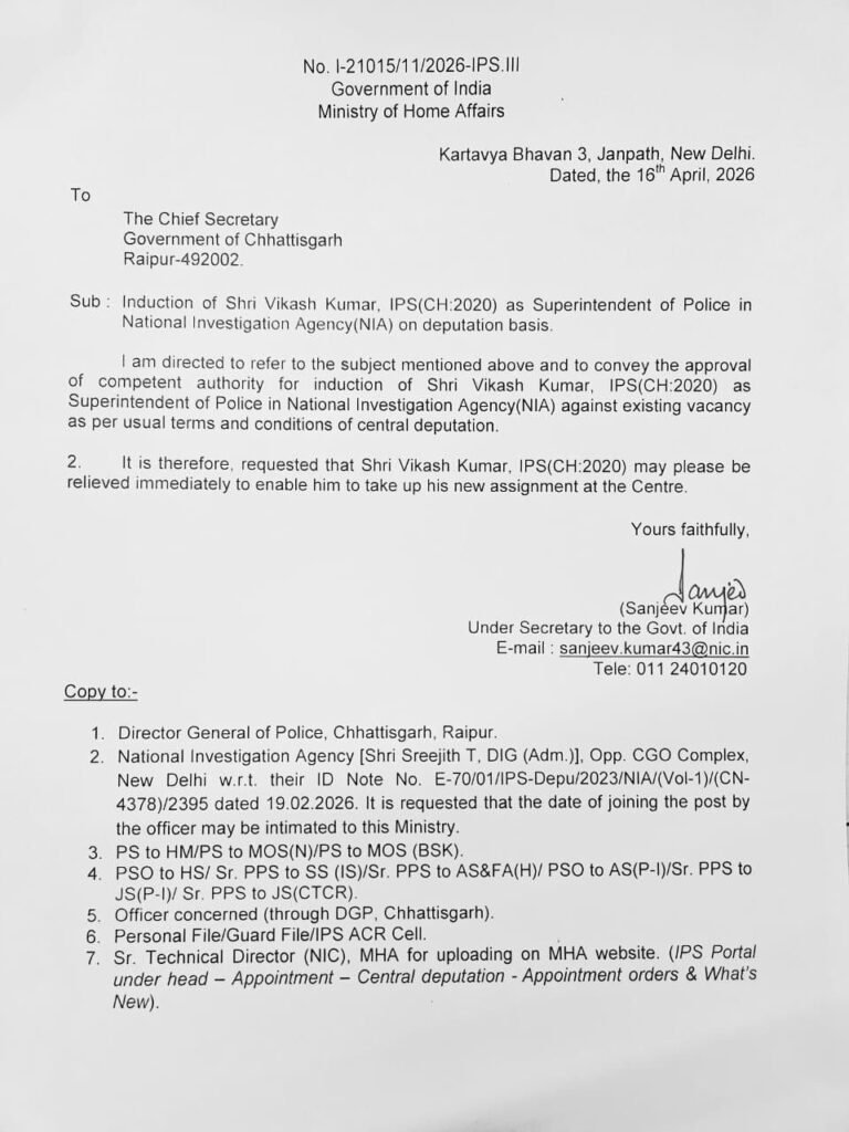 CG IPS News:– रायपुर। छत्तीसगढ़ कैडर के 2020 बैच के आईपीएस अधिकारी विकास कुमार को National Investigation Agency (एनआईए) में पुलिस अधीक्षक (एसपी) के पद पर प्रतिनियुक्ति मिली है। इस संबंध में Ministry of Home Affairs (गृह मंत्रालय) ने आदेश जारी कर दिए हैं।