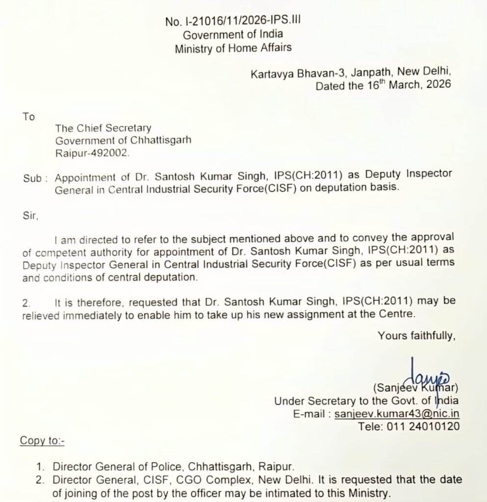 IPS Santosh Singh:-छत्तीसगढ़ कैडर के 2011 बैच के आईपीएस डॉ. संतोष सिंह को केंद्रीय प्रतिनियुक्ति पर भेजा गया है। Ministry of Home Affairs के आदेश के बाद उन्हें केंद्रीय औद्योगिक सुरक्षा बल (CISF) में डीआईजी के पद पर तैनाती मिली है। वर्तमान में वे पुलिस मुख्यालय में डीआईजी CCTNS/SCRB के पद पर पदस्थ हैं और अपने नशा विरोधी ‘निजात’ अभियान के कारण राष्ट्रीय–अंतरराष्ट्रीय स्तर पर चर्चित रहे हैं।