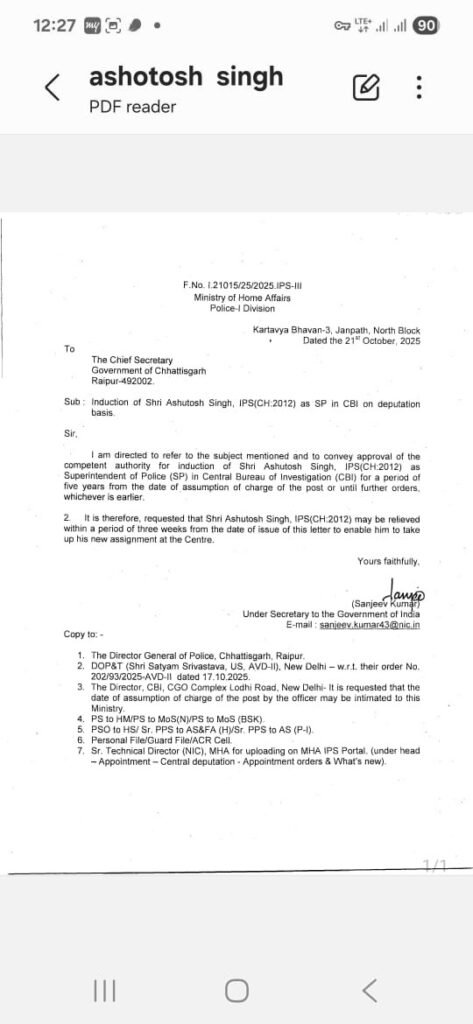 CG IPS News:– छत्तीसगढ़ कैडर के 2012 बैच के आईपीएस अधिकारी आशुतोष सिंह को प्रतिनियुक्ति (डेपुटेशन) पर सेंट्रल ब्यूरो ऑफ इन्वेस्टिगेशन (CBI) में पुलिस अधीक्षक (SP) के पद पर पदस्थ करने का आदेश मिनिस्ट्री ऑफ होम अफेयर्स (Ministry of Home Affairs) ने जारी किया है। 21 अक्टूबर 2025 को गृह मंत्रालय की ओर से जारी आदेश के मुताबिक, उनका कार्यकाल सीबीआई में ज्वाइनिंग की तिथि से अगले पांच वर्ष या अगले आदेश तक (जो भी पहले हो) रहेगा। फिलहाल आशुतोष सिंह महासमुंद जिले के पुलिस अधीक्षक के पद पर कार्यरत हैं।