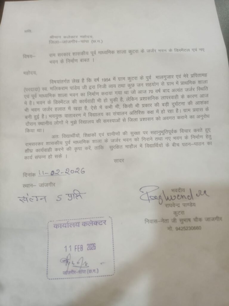 ग्राम पंचायत कुटरा के संरक्षक राघवेन्द्र पाण्डेय ने कलेक्टर को पत्र लिखकर जर्जर भवन को शीघ्र हटाकर नए भवन निर्माण की प्रक्रिया प्रारंभ करने की मांग की है। उनका कहना है कि विद्यार्थियों, शिक्षकों और ग्रामीणों की सुरक्षा सर्वोपरि है और बच्चों को सुरक्षित वातावरण में शिक्षा मिलना शासन की प्राथमिक जिम्मेदारी है।