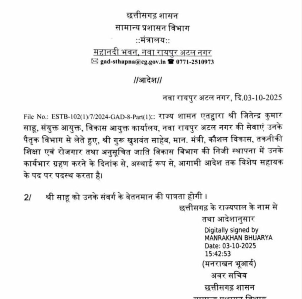 जितेंद्र साहू, जो वर्तमान में नवा रायपुर अटल नगर में विकास आयुक्त कार्यालय में संयुक्त आयुक्त के पद पर कार्यरत हैं, उनकी सेवाएं उनके पैतृक विभाग से लेते हुए मंत्री कौशल विकास, तकनीकी शिक्षा, रोजगार और अनुसूचित जाति विकास विभाग की निजी स्थापना में उनके कार्यभार ग्रहण करने की तिथि से अस्थायी रूप से आगामी आदेश तक विशेष सहायक के रूप में निर्धारित की गई हैं।