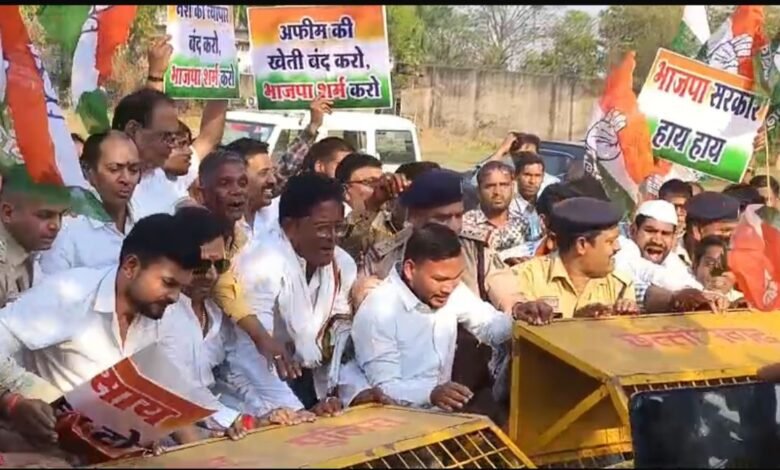 कांग्रेस के बैनर तले हुए इस प्रदर्शन का नेतृत्व राजेश अग्रवाल ने किया। उनका आरोप है कि राज्य में अफीम की खेती का मामला सामने आने के बाद सरकार चुप्पी साधे बैठी है।