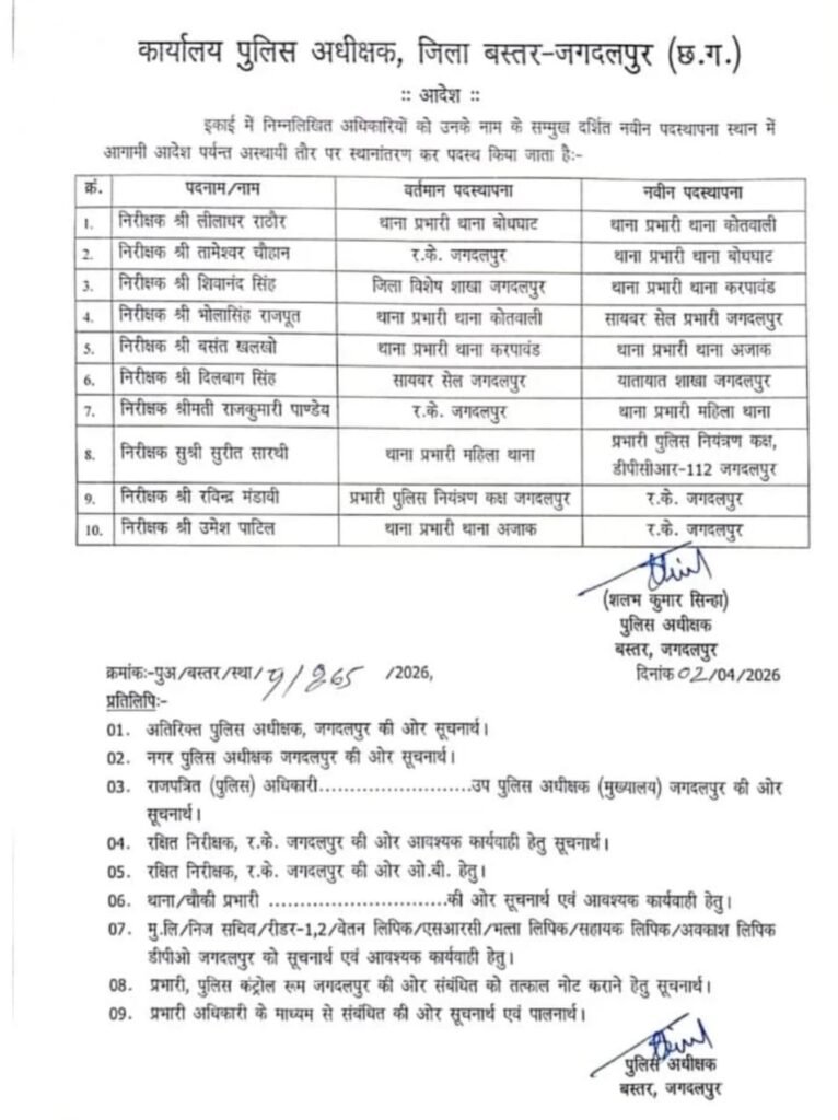 Jagdalpurजगदलपुर। बस्तर एसपी शलभ सिन्हा ने दस पुलिस निरीक्षकों का तबादला आदेश जारी किया है। प्रशासनिक दृष्टिकोण से किए गए तबादले में दो निरीक्षकों को लाइन से थाने भेजा गया है। वही दो निरीक्षकों को थाने से लाइन रवानगी दी गई हैं। देखें सूची….