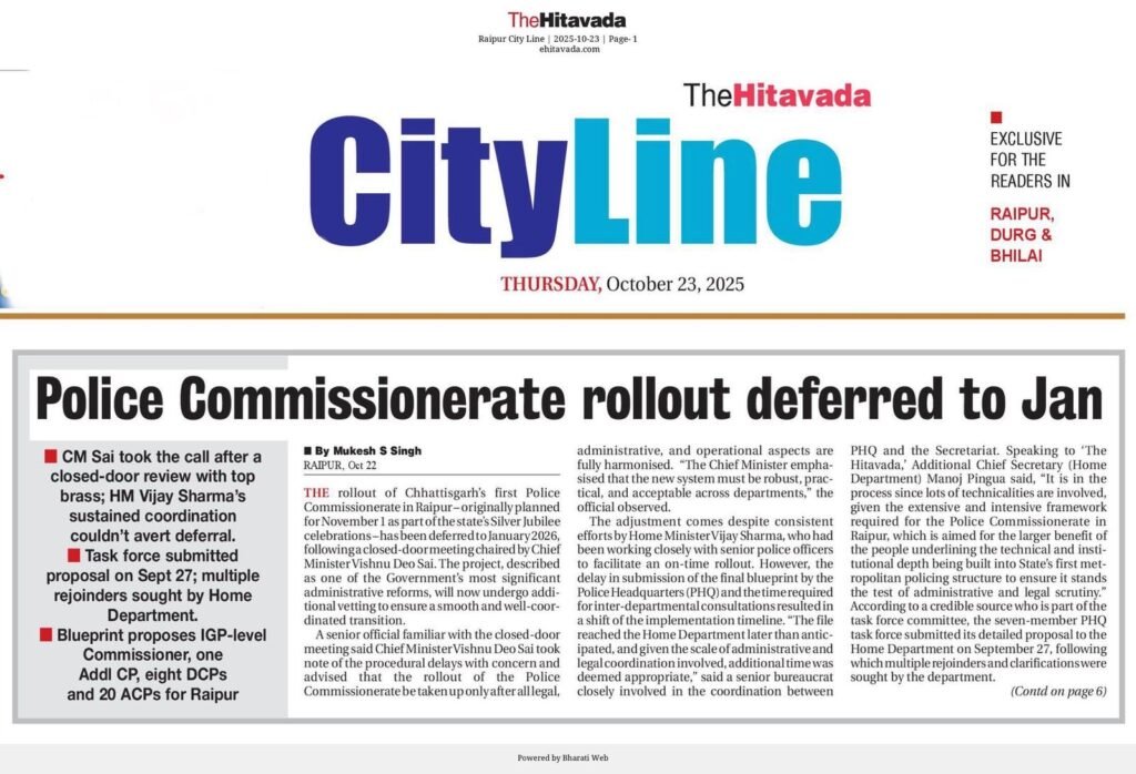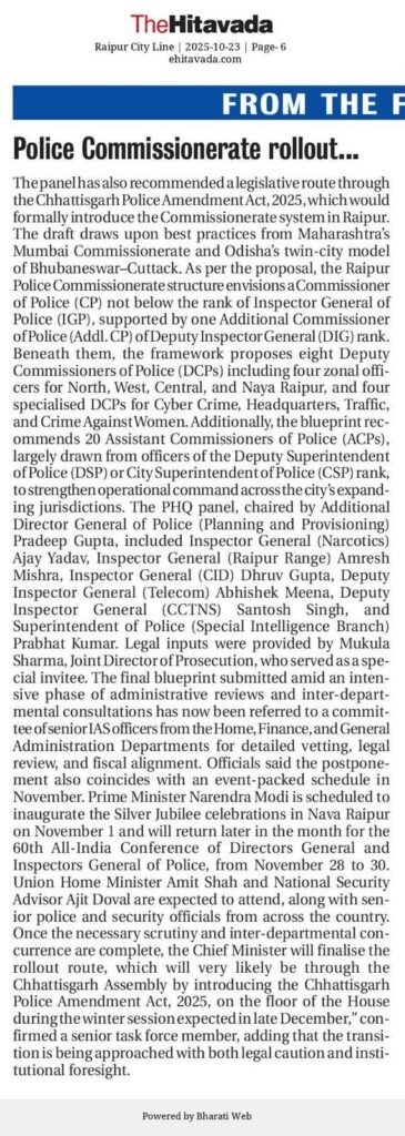 Chhattisgarh Big Big Breaking News :–रायपुर, 23 अक्टूबर।रायपुर ज़िले में प्रस्तावित पुलिस आयुक्त प्रणाली (Police Commissionerate System) की लॉन्चिंग अब जनवरी 2026 में होगी।