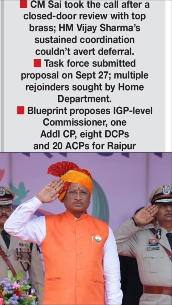 Chhattisgarh Big Big Breaking News :–मुख्यमंत्री साय ने शीर्ष अधिकारियों के साथ उच्च स्तरीय गोपनीय बैठक में लिया निर्णय, गृह मंत्री विजय शर्मा के लगातार समन्वय के बावजूद तय तारीख टली पुलिस मुख्यालय की टास्क फोर्स ने 27 सितंबर को सौंपी रिपोर्ट, गृह विभाग ने मांगे कई स्पष्टीकरण प्रस्तावित ढांचा: आईजी रैंक का पुलिस आयुक्त, डीआईजी रैंक का अतिरिक्त आयुक्त, आठ डीसीपी और 20 एसीपी की संरचना