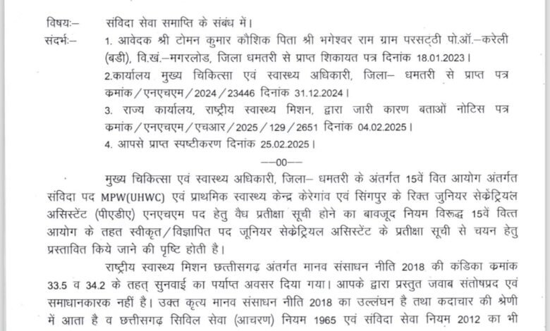 • रविवार के अवकाश के दिन राज्य NHM कार्यालय से सेवा समाप्ति आदेश जारी किया गया, जो संदेहास्पद है।