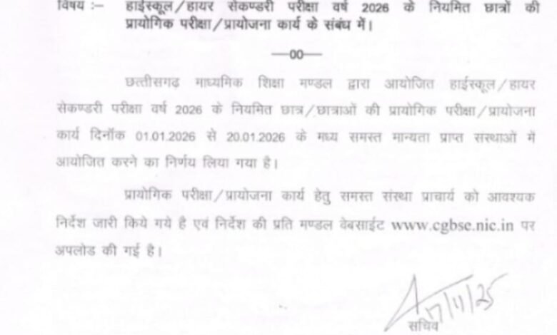 CG Board Practical Exam News:– माध्यमिक शिक्षा मंडल ने जारी की प्रैक्टिकल परीक्षा की तारीखें, 20 दिनों में पूरी होंगी सभी परीक्षाएं