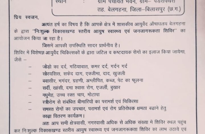 CG Health News: ग्राम पंचायत पंडरापथरा (बेलगहना) में विकासखण्ड स्तरीय आयुष स्वास्थ्य शिविर कल