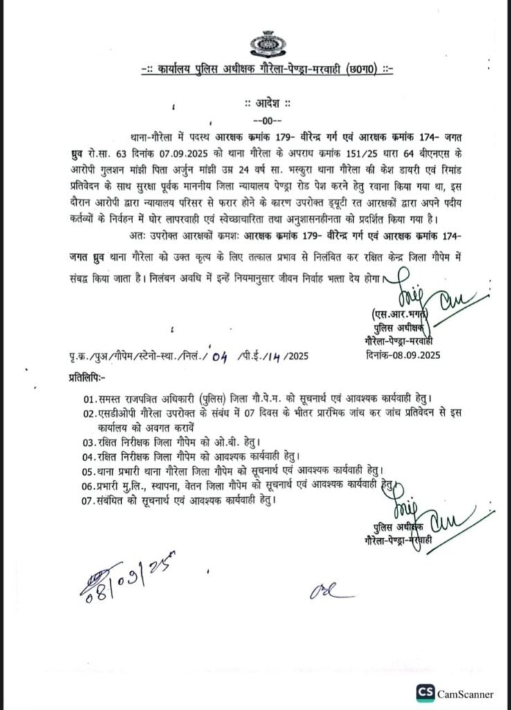 GPM जीपीएम। गौरेला–पेंड्रा–मरवाही जिले में कानून व्यवस्था को चुनौती देने वाली गंभीर घटना सामने आई है। पेंड्रारोड न्यायालय में न्यायिक रिमांड के लिए पेश किए गए आरोपी गुलशन मांझी पुलिस की सुरक्षा से भागने में सफल हो गया। मामले को गंभीर मानते हुए पुलिस अधीक्षक सुरजन राम भगत ने सुरक्षा ड्यूटी पर तैनात आरक्षक वीरेंद्र गर्ग और आरक्षक जगत ध्रुव को निलंबित कर दिया।