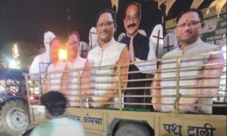 पशु ढोने वाले वाहन में नेताओं के कटआउट परिवहन का हुआ विरोध — निगम आयुक्त ने तीन अफसरों को थमाया नोटिस,