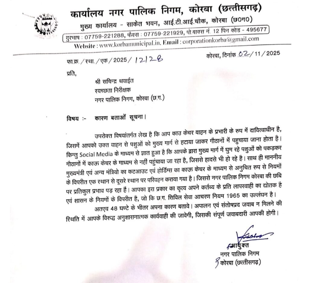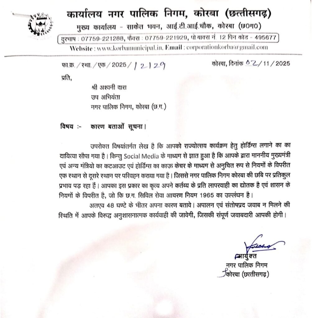 इस बार आयुक्त ने उप अभियंता अश्विनी दास, स्वच्छता निरीक्षक रविंद्र थवाईत, और उप अभियंता अभय मिंज को जिम्मेदार मानते हुए नोटिस जारी किया है। इन तीनों पर उन्होंने कर्तव्य में घोर लापरवाही और छत्तीसगढ़ सिविल सेवा आचरण नियम 1965 के उल्लंघन का आरोप लगाया गया है।