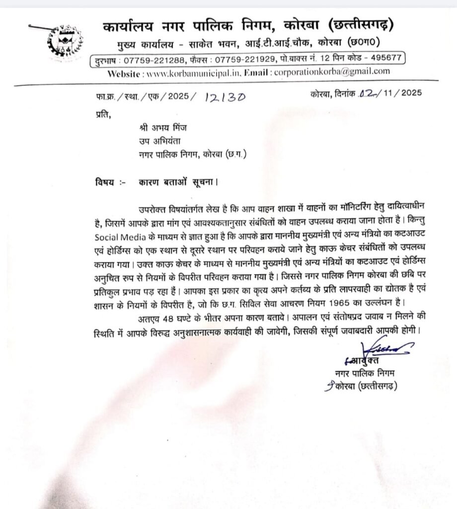 आयुक्त आशुतोष पांडेय ने मामले को गंभीरता से लेते हुए तीन अधिकारियों को कारण बताओ नोटिस जारी कर 48 घंटे में जवाब तलब किया है। बताया जा रहा है कि यह घटना दूसरी बार दोहराई गई है, जबकि 11 सितम्बर 2025 को भी इसी तरह नेताओं के कटआउट पशु ट्रॉली में ढोए जाने पर चेतावनी दी गई थी।