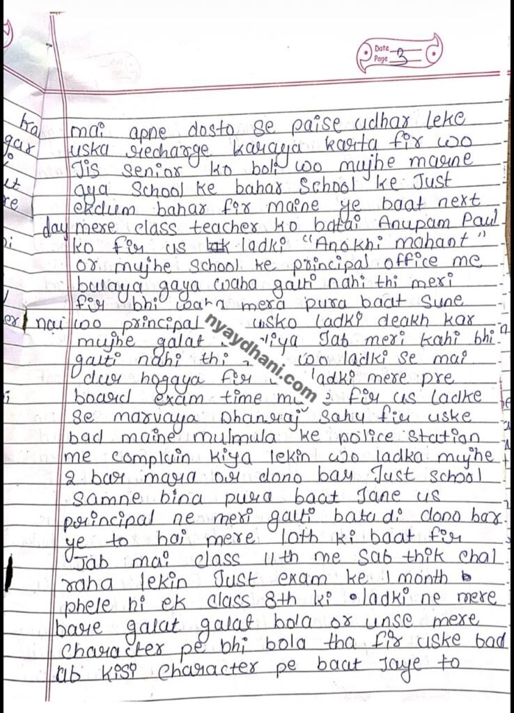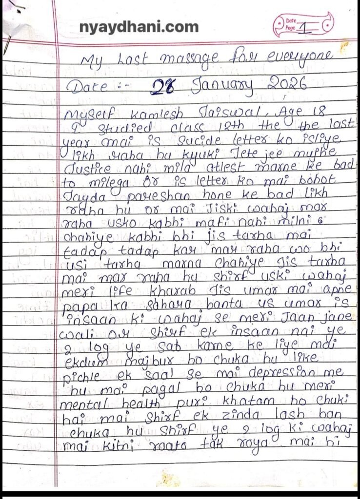 सुसाइट नोट में मृतक छात्र कमलेश जायसवाल ने परेशान हो करके लिखा है कि जीते जी मुझे न्याय नहीं मिला लेकिन मरने के बाद तो मिलेगा। जिसके वजह से मर रहा हूं उन्हें कभी माफी नहीं मिलनी चाहिए जिस तरह से मैं तड़प कर मर रहा हूं उसी तरह से मरने चाहिए। जिस उम्र में अपने पापा का सहारा बनता, मगर मुझे मरना पड़ रहा है जिसके 2 लोग जिम्मेदार है पिछले 1 साल से मैं डिप्रेशन में चल रहा था मेंटल स्थिति खत्म हो चुकी है एक जिंदा लाश हो चुका हूं सिर्फ इन दो लोगों की वजह से है। जिसमें पुराने स्कूल के प्राचार्य सुमंतो विश्वास और क्लास 10 का टीचर अनुपम पाल और न्यूवोको पब्लिक स्कूल है। अभी मैं 12 वी दूसरे स्कूल में हु,जब मैं 10 वी में था तो अनुपम पाल क्लास टीचर था उस समय जब हाफ इयरली उससे पहले लड़की मेरी जूनियर ने इंस्टाग्राम में मुझे फॉलो कर मैसेज करने लगी रोज बात करने लगी फिर मेरे से पैसा मांगना शुरू की और मोबाईल रिचार्ज भी करवाने लगी दोस्तो से पैसे लेकर रिचार्ज भी कराया। फिर उस लड़की ने स्कूल के एक एक्स सीनियर धनराज साहू को मेसेज कर बोली कि कमलेश मुझे परेशान कर रहा है। जब की ऐसा कुछ भी नहीं था ,तब सीनियर मुझे मारने स्कूल के बाहर आया था। दूसरे दिन सारी बातें क्लास टीचर को वह छात्रा ने बताया तब हम दोनों को प्राचार्य के ऑफिस बुलाया गया। जहां मेरी गलती नहीं थी मेरी बातों को सुना नहीं गया प्राचार्य ने लड़की है देख कर पूरी मेरी गलती बोल दिया गया। जबकि मेरी कोई गलती नहीं थी, जिसके बाद मैं उस लड़की से दूर चला गया। उसके बाद प्री एग्जाम के समय फिर धनराज साहू से मरवाया। जिसके बाद मुलमुला थाने में शिकायत भी की थी। दो बार मारने के बाद भी फिर से प्राचार्य ने मेरी गलती बता दी।