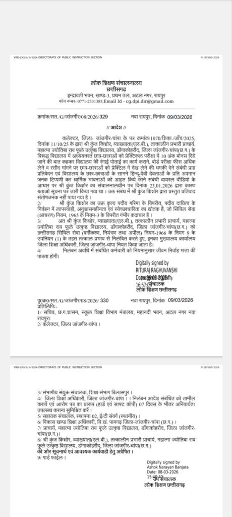 Janjgir Champa News:-छात्रों से पैसे मांगने और देवी-देवताओं पर अपमानजनक टिप्पणी का वीडियो वायरल होने के बाद लोक शिक्षण संचालनालय ने की कार्रवाई।
