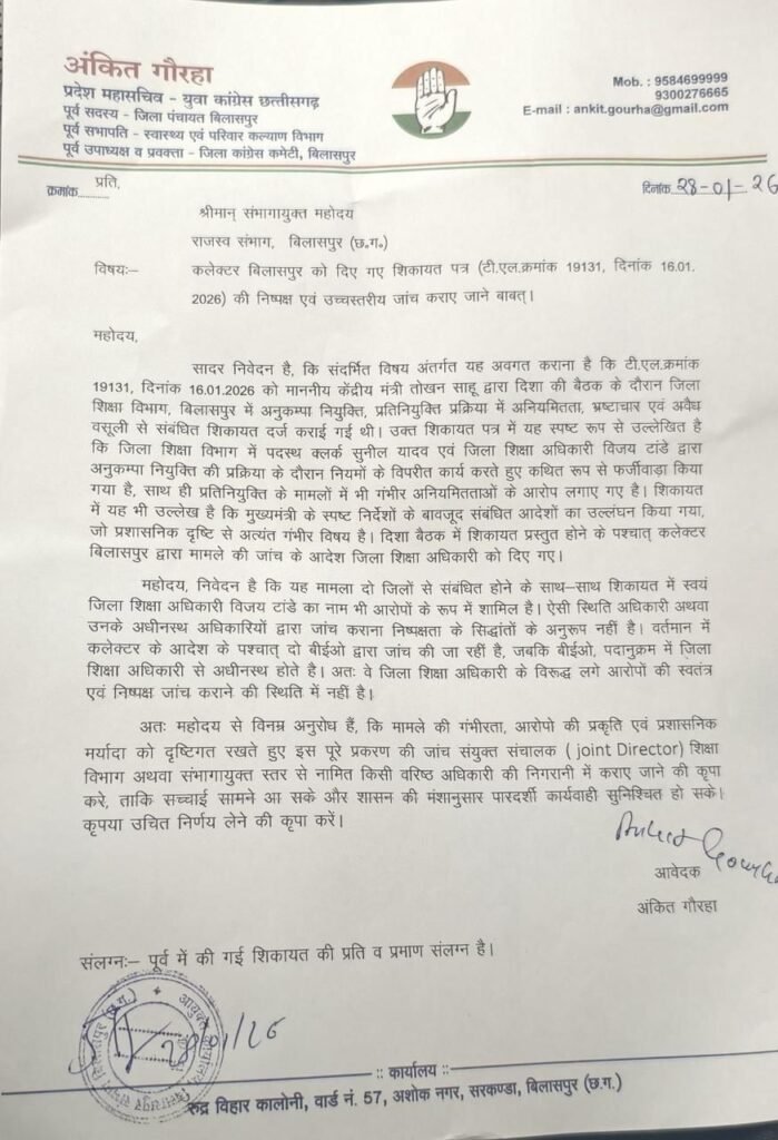 Bilaspur- शिक्षा विभाग में अनुकंपा नियुक्तियों को लेकर चल रहे कथित खेल ने प्रशासनिक ईमानदारी पर गंभीर सवाल खड़े कर दिए हैं। कांग्रेस नेता अंकित गौराहा ने इसे “संगठित भ्रष्टाचार” करार देते हुए कमिश्नर को लिखित शिकायत सौंपी और चेताया कि यदि जांच ज्वाइंट डायरेक्टर या कमिश्नर स्तर पर निष्पक्ष रूप से नहीं हुई, तो मामला डीपी और सचिव स्तर तक ले जाया जाएगा। जरूरत पड़ी तो आंदोलन और धरना भी किया जाएगा।