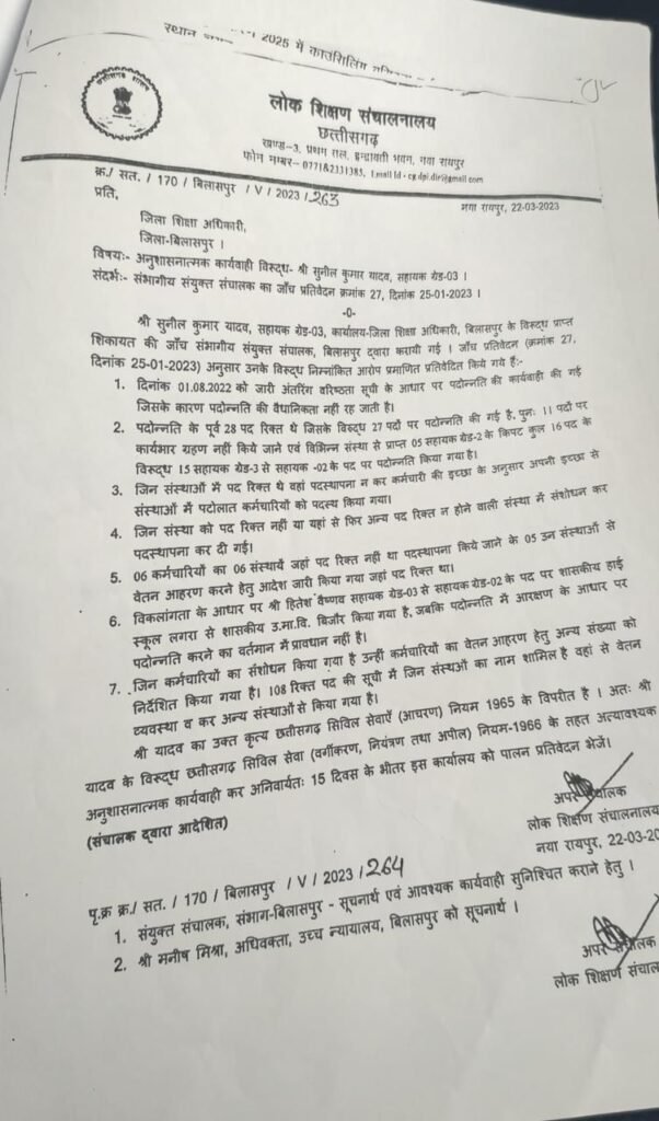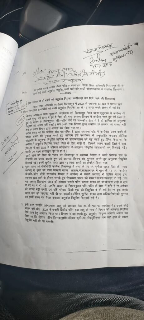 शिकायत में बताया गया है कि शिक्षा विभाग ने नियमों को ताक पर रखकर एक ही घर की दो सगी बहनों को अनुकंपा नियुक्ति दी। मृत कर्मचारी की पहली पत्नी की संतान यश साहू को नियुक्त किया गया, जबकि नियम स्पष्ट रूप से कहते हैं कि एक परिवार से केवल एक अनुकंपा नियुक्ति वैध है। इसके बावजूद दूसरी पत्नी के पुत्र को भी नियुक्त कर दिया गया।