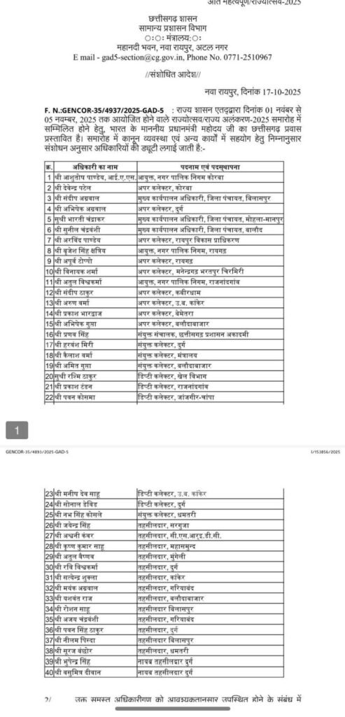 PM Narendra Modi Visit in Chhattisgarh:–राज्योत्सव आगमन पर कानून व्यवस्था और अन्य कार्यों में सहयोग हेतु आईएएस समेत 40 अफसरों की ड्यूटी