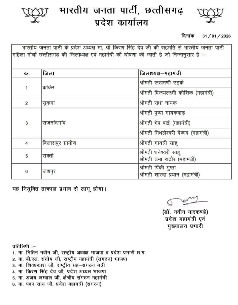 जारी सूची के अनुसार कांकेर, सुकमा, राजनंदगाँव , बिलासपुर ग्रामीण, सक्ती, और जशपुर सहित कई जिलों में महिला मोर्चा की जिम्मेदारी नए पदाधिकारियों को सौंपी गई है। पार्टी सूत्रों के अनुसार, नियुक्तियों में संगठनात्मक अनुभव, सक्रियता और क्षेत्रीय कार्यों में योगदान को प्राथमिकता दी गई है।