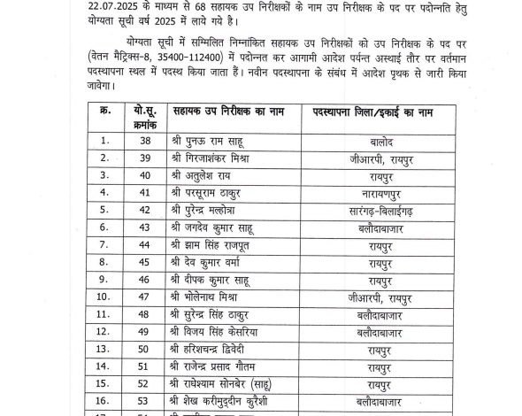 Raipur रायपुर। छत्तीसगढ़ पुलिस मुख्यालय ने 17 एएसआई को एसआई पद पर प्रमोट करने की स्वीकृति दी है। इससे पूर्व 27 मई 2025 को कुल 68 सहायक उप निरीक्षकों की फिट सूची जारी की गई थी, जिसमें शामिल कई एएसआई का प्रमोशन पहले ही किया जा चुका है। अब उसी सूची में शेष रहे 17 एएसआई को उप निरीक्षक के पद पर पदोन्नति दी गई है।
