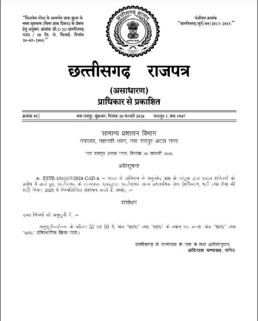 बिलासपुर – राज्य शासन के सामान्य प्रशासन विभाग द्वारा जारी अधिसूचना क्रमांक 91 [ESTB-101(1)/7/2024-GAD-4] के अनुसार राज्य प्रशासनिक सेवा में पदोन्नति से भर्ती का प्रतिशत बढ़ाकर पुनः 50 प्रतिशत कर दिया गया है। इससे पहले पदोन्नति एवं सीधी भर्ती का अनुपात 50-50 था, जिसे वर्ष 2020 के बाद घटाकर 40-60 कर दिया गया था।
